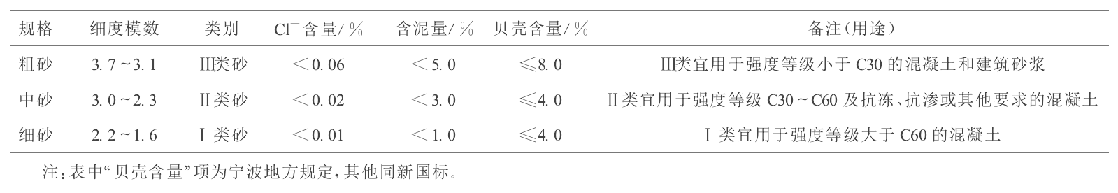 新國(guó)標(biāo)《建筑用砂》(GB/T14686-2001)對(duì)原國(guó)標(biāo)貝殼含量作了補(bǔ)充規(guī)定并從2002年2月1日開(kāi)始實(shí)施,它對(duì)砂的分類(lèi)與規(guī)格作出了新的規(guī)定,淡化海砂的控制指標(biāo)如下圖