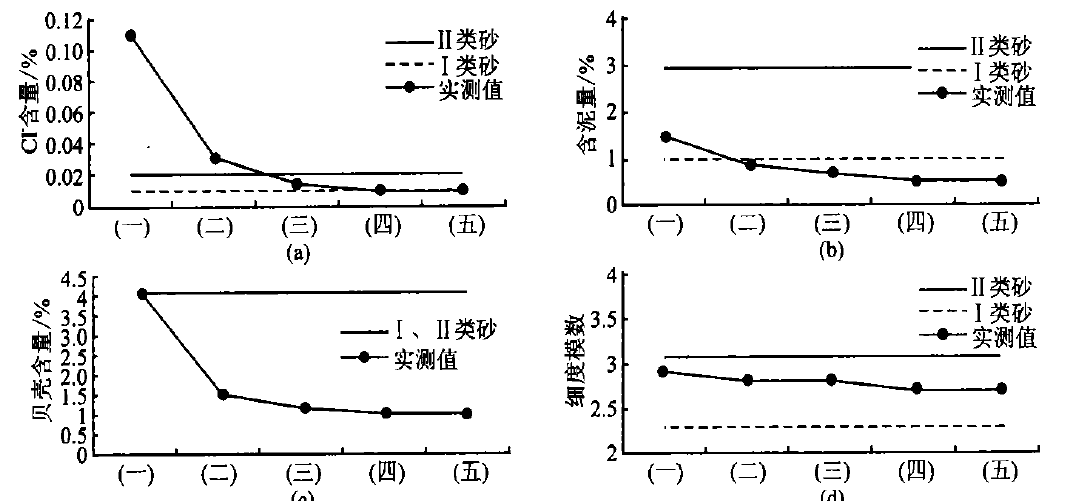 經(jīng)過(guò)實(shí)地檢測(cè)(見(jiàn)下圖)可知,一道和第二道加工工序非常關(guān)鍵,一道工序經(jīng)滾筒篩去除粗顆粒,粗貝殼等,(篩孔不大于8mm)加之淡水沖洗氯離子含量降低達(dá)70%左右,含泥量降低40%,貝殼含量降低了60%,檢測(cè)效果非常顯著。經(jīng)過(guò)第二道工序后氯離子含量降低15%,含泥量降低了12%,貝殼含量降低10%。海砂淡化綜合指標(biāo)已經(jīng)全面達(dá)到二類(lèi)砂標(biāo)準(zhǔn),貝殼含量和含泥量已經(jīng)達(dá)到了一類(lèi)砂標(biāo)準(zhǔn)。經(jīng)過(guò)第三道輪式洗砂機(jī)淘洗濾水后各項(xiàng)指標(biāo)繼續(xù)降低,氯離子含量繼續(xù)下降3%,貝殼含量下降2%,而含泥量又大幅下降10以上。實(shí)測(cè)值為:氯離子0.01% 含泥量0.6% 貝殼含量1.1%。根據(jù)這個(gè)指標(biāo)可以明顯得到結(jié)論:該生產(chǎn)線生產(chǎn)的淡化海砂作為二類(lèi)中砂用于C30--C60的混凝土配制是完全沒(méi)有問(wèn)題的,除細(xì)度模數(shù)之外其他指標(biāo)均達(dá)到了一類(lèi)砂標(biāo)準(zhǔn)。
